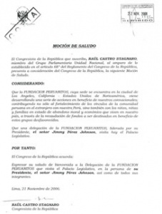 “Me da sumo placer poderle dar la bienvenida a los miembros de la Fundación Peruanitos, y en especial a su Presidente Jimmy Pérez Johnson, cuyo trabajo ha sido ejemplar y meritoria de elogios”, manifestó el congresista al presentar la copia de la moción.